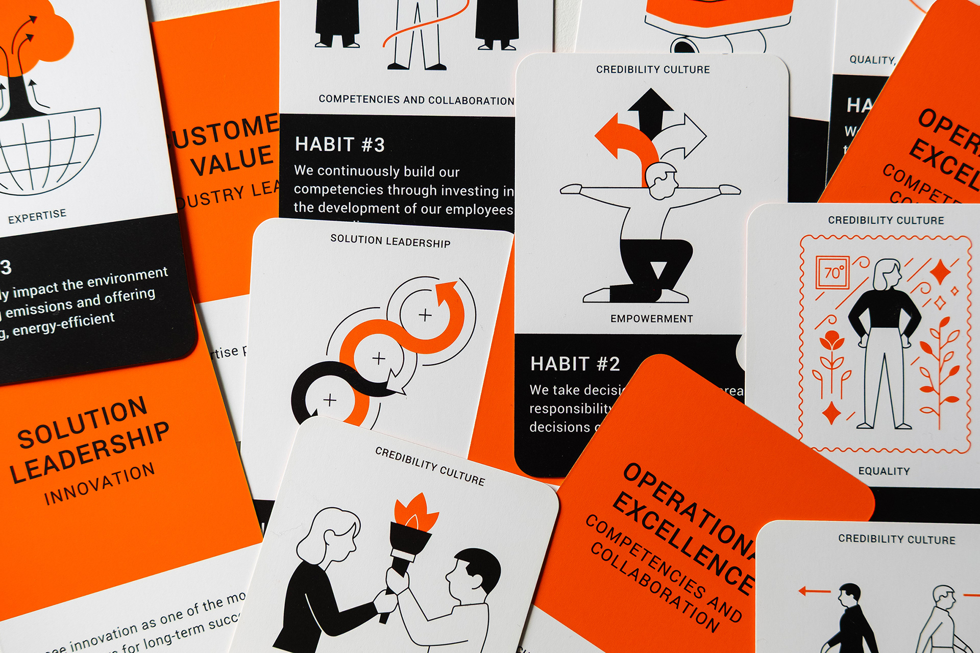 We were commissioned to illustrate playing cards around the topic of team building. The icons had to accompany the text of the cards. Topics for the icons included, sharing feedback resolving problems together, caring for the environment, innovation and more.